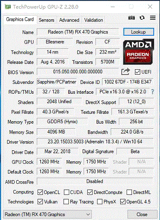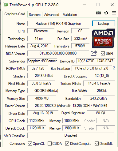 涉及BIOS问题,少不了GPU-Z,运行GPU-Z后得知显卡是470 4G 海力士颗粒。