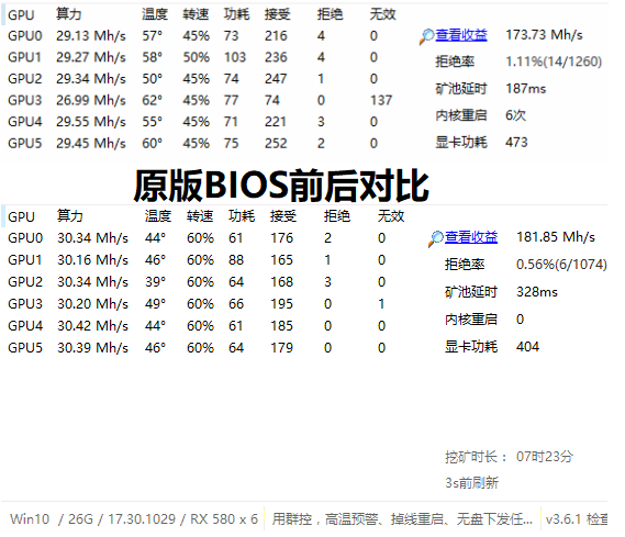 作为对比,下图列举了矿版BIOS和原版BIOS的效果。