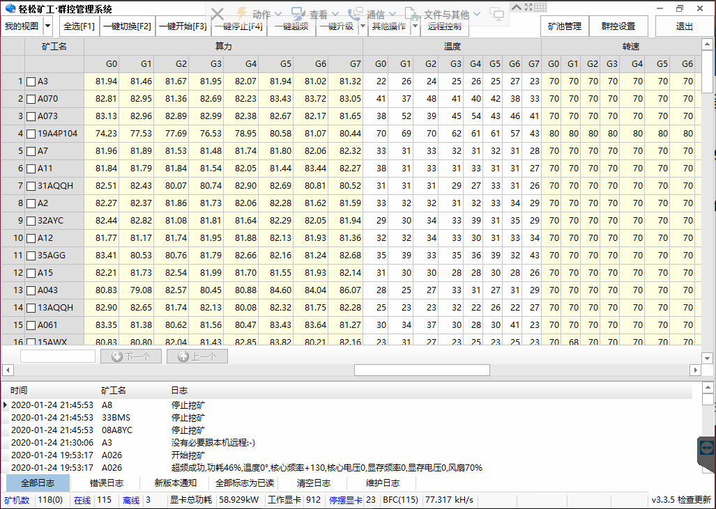 除了可以查看所有矿机的算力、功耗、温度、风扇等信息以外,大部分常用功能,都是“一键式”操作。