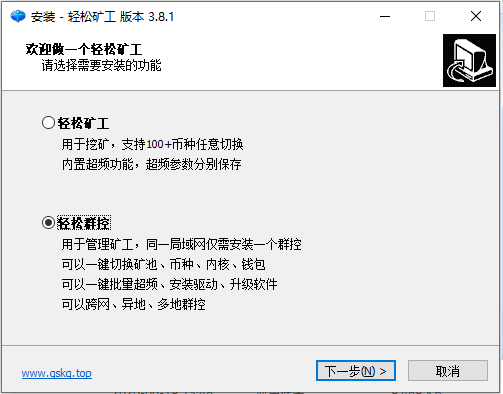 在电脑下载轻松矿工,双击运行,选择“轻松群控”后按提示完成安装。