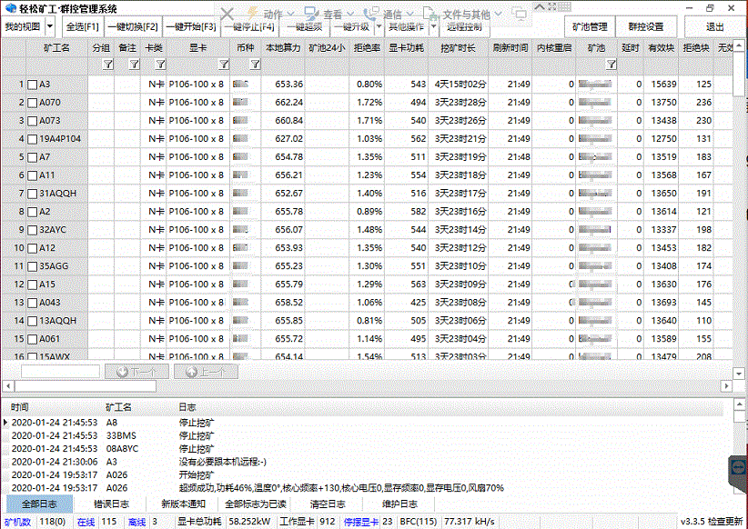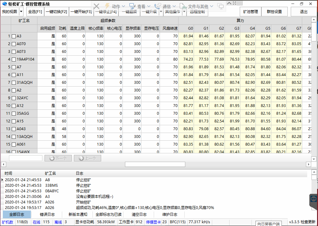 除了可以查看所有矿机的算力、功耗、温度、风扇等信息以外,大部分常用功能,都是“一键式”操作。
