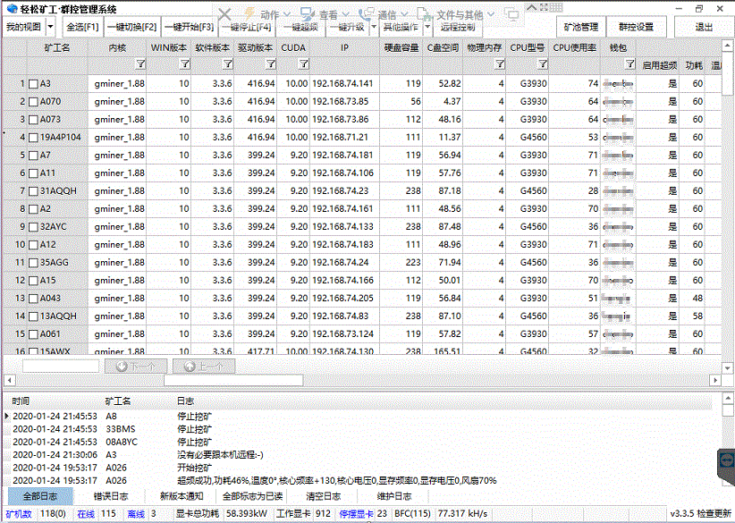 部分内核日新月异,常常有较大算力的提升和重要的bug修复,使用群控的“一键切换”功能,所有的矿机可以在数分钟内完成升级。