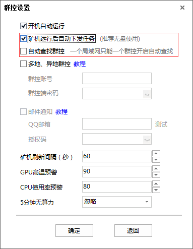 2. 点击群控设置,勾选自动下发任务,不勾选自动查找群控。