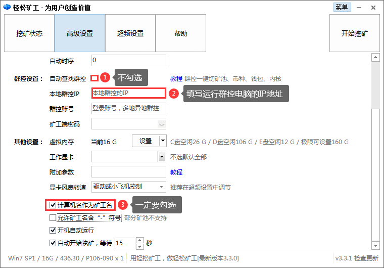 3. 矿工端的高级设置必须勾选“计算机名作为矿工名”
